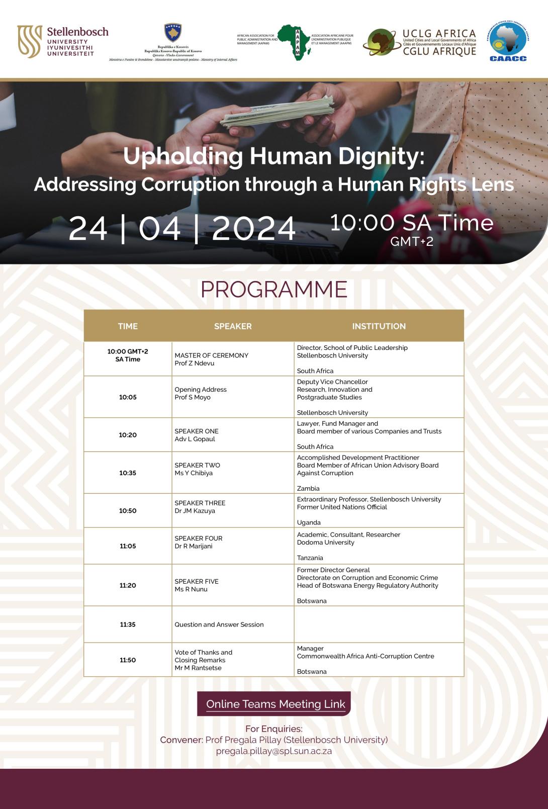 Event Date Wed, 24 Apr 2024 Event Start 10:00 am Attachment Size Addressing Corruption through a Human Rights Lens Concept Note .pdf (266.5 KB) 266.5 KB Event Location Virtual Meeting email facebook linkedin twitter pinterest